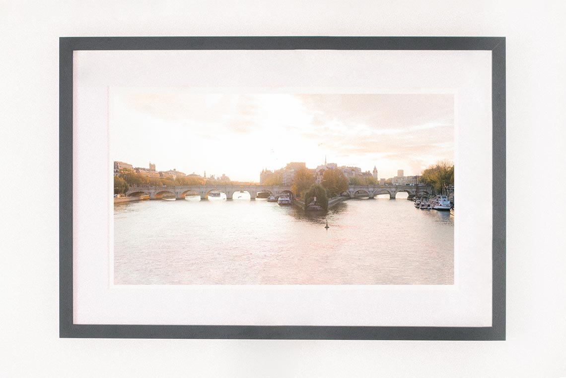 En commandant le tirage et son cadre, la Photographie sera encadrée avec passepartout sans acide de 2mm, un verre spécifique de Musée (aussi appelé Verre Mirogard) avec une transparence exceptionnelle, un traitement anti UV, protégeant la Photographie pour une conservation optimale, réduisant les reflets, sans distorsion des couleurs, et avec un beau cadre de Galerie en bois massif (disponible naturel, bois clair, ou en noir/blanc).