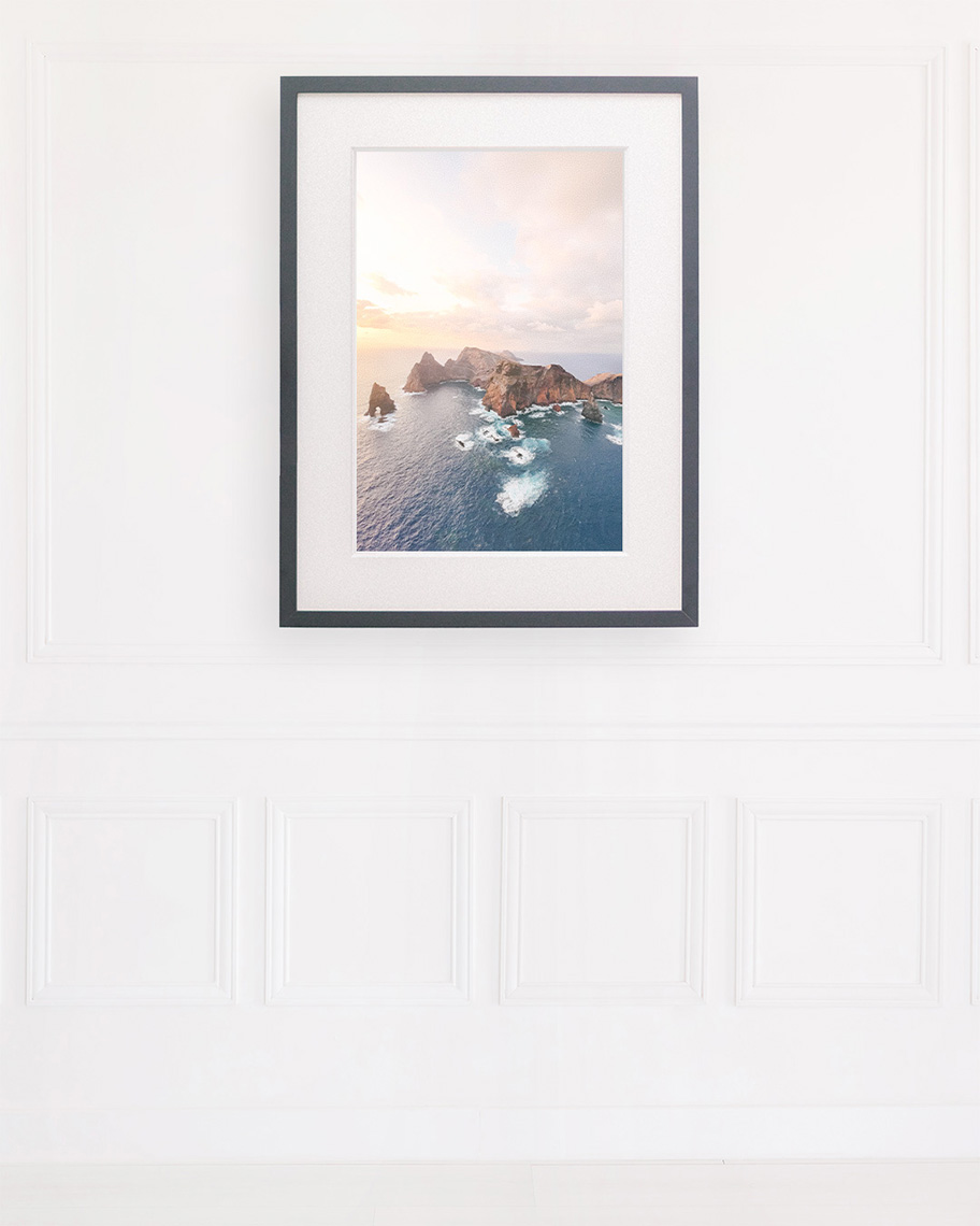 En commandant le tirage et son cadre, la Photographie sera encadrée avec passepartout sans acide de 2mm, un verre spécifique de Musée (aussi appelé Verre Mirogard) avec une transparence exceptionnelle, un traitement anti UV, protégeant la Photographie pour une conservation optimale, réduisant les reflets, sans distorsion des couleurs, et avec un beau cadre de Galerie en bois massif (disponible naturel, bois clair, ou en noir/blanc).