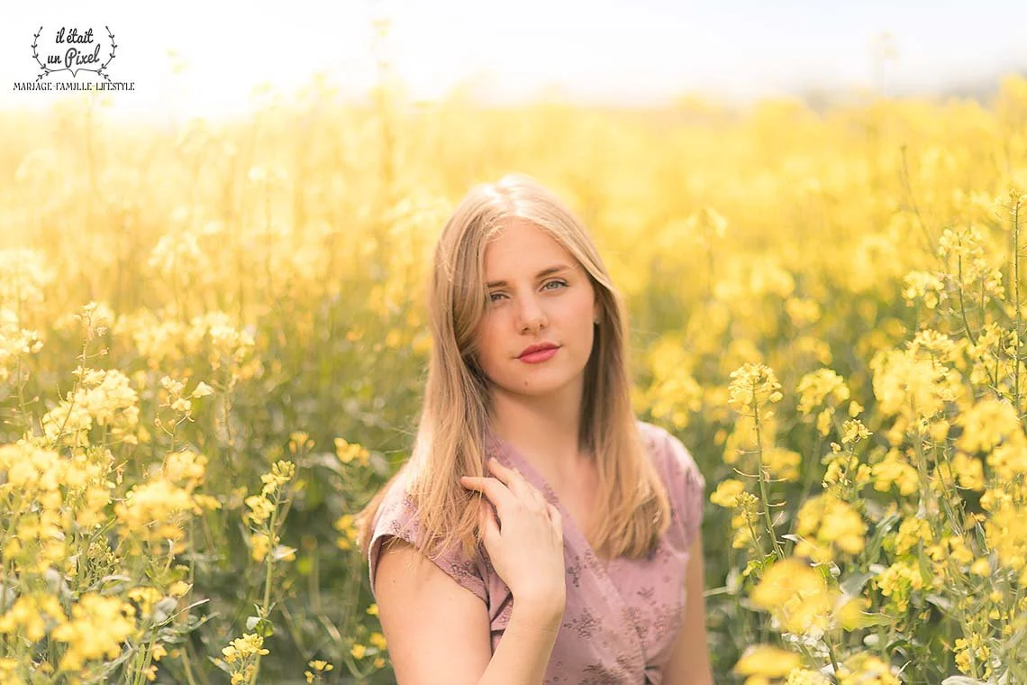 La campagne des Yvelines et du Val d'Oise est tapissée de jaune avec la floraison des champs de colza à perte de vue, ce décor a inspiré quelques portraits pour cette séance photo en extérieur.